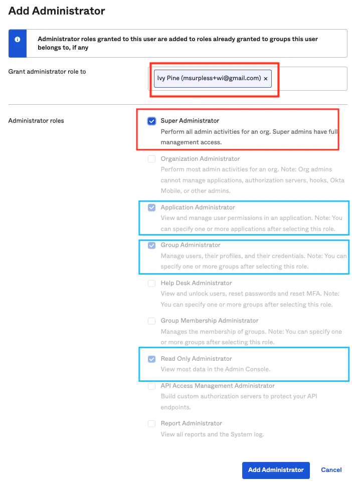 Select the administrator roles to grant: Read Only Admin, Super Administrator, or a combination of Read Only + Application Admin + Group Admin.